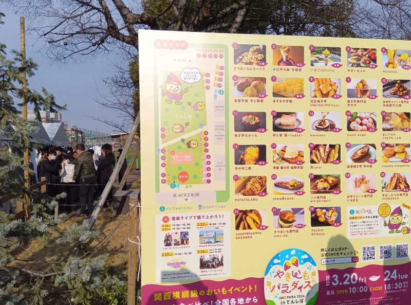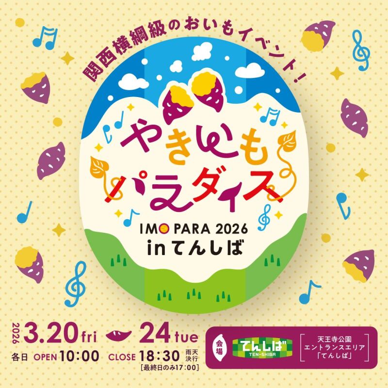 「やきいもパラダイス 2026 in てんしば」3月20日(金・祝)~3月24日(火) Posted on 2026年3月20日2026年3月20日 by うえまちウェブ編集者 今年もてんしばで大人気イベント「やきいもパラダイス」。 今年は全国各地から注目の28店舗が勢揃いします! 3月20日(金・祝)~3月24日(火) https://www.tennoji-park.jp/event/detail/19d82c11-7db1-4da9-939e-6b1e2c1222a4 開催時間10:00~18:30(最終日のみ17:00)※雨天決行、荒天中止入場料無料(ご飲食代は別途必要)主催やきいもパラダイス実行委員会