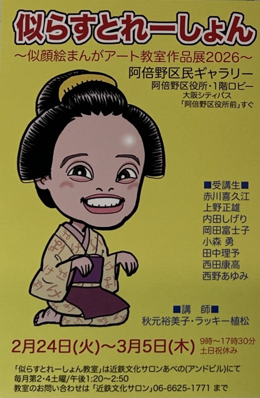 阿倍野区のあべのand「近鉄文化サロン」で開講されている「似顔絵まんがアート教室」の方々の作品展が「阿倍野区民ギャラリー(阿倍野区役所1階)」で開催されます。