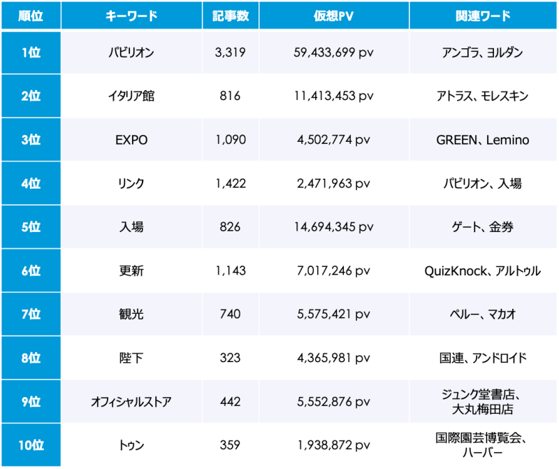 1位「パビリオン」関連で話題となったのがヨルダン館の展示のその後。人気の「赤い砂」が鳥取県へ送られることが決定し、アクセス数が伸びたようです。また、徳島県へ、万博記念公園へ、と、展示物の移転先が話題となりました。