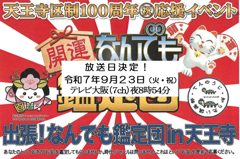 天王寺区の任意団体「てんのうじ知りたい倶楽部」は、2025年天王寺区制100周年を迎えるにあたり、天王寺区民の方々に区制100年の周知と区民が盛り上がる行事を企画。 天王寺区出身の今田耕司さん司会でおなじみの「開運・なんでも鑑定団」(テレビ東京制作)「出張!なんでも鑑定団in天王寺」を天王寺区に招致することが決定しました。 テレビ収録は令和7年8月17日(日)クレオ大阪中央(天王寺区上汐5丁目6-25)のホールで行なわれます。 主催は「てんのうじ知りたい倶楽部」、天王寺区役所 市民協働課(教育文化)の協力を得て開催します。 皆さんお持ちのお宝(ジャンルは問いません、陶器、お軸、おもちゃ、古銭等々)を募集しています。ぜひ鑑定してもらってください。