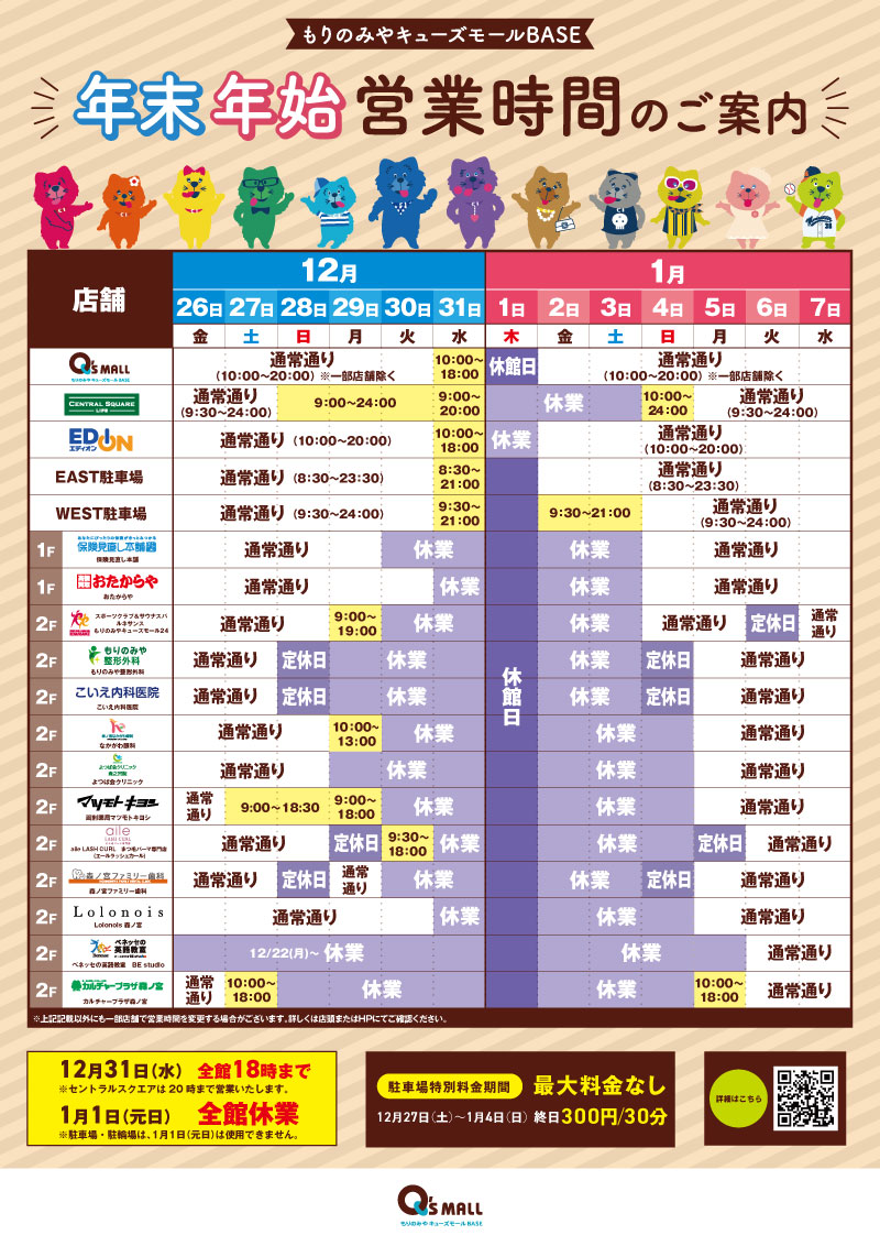 あべのキューズモール、もりのみやキューズモールBASE、年末年始の営業時間 Posted on 2025年12月28日2025年12月28日 by うえまちウェブ編集者 →あべのキューズモール ※1月1日(木・祝)は、駐輪場は通常営業、駐車場は北側5階のみ ※1月2日(金)は混雑が予想されるため早めにオープンする可能性あり ※上記以外にも一部店舗で営業時間内に受付を終了する場合あり 駐車場特定日料金12月27日(土)~1月4日(日)の駐車場料金が下記に変更になります終日30分350円、最大料金無し(最初の30分無料) →もりのみやキューズモールBASE 【その他営業時間の異なる店舗】■1F クリーニングルビー1月2日(金)・3日(土) 10時~18時(通常20時まで)