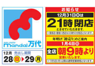 12月31日(水)21時閉店(一部20時50分の店舗あり)