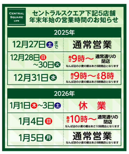 12/28(日)〜12/30(火) 9時〜通常通り