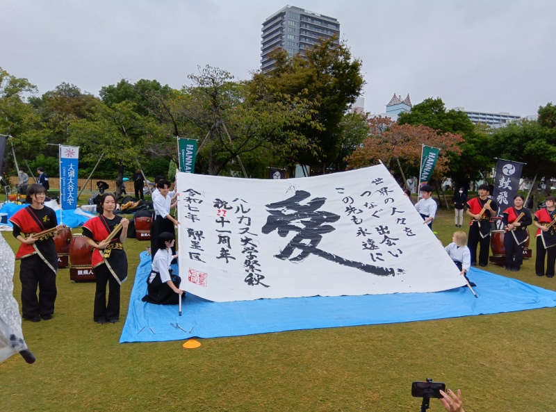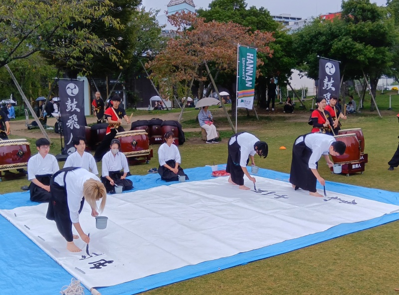 続いて同大学書道部「解墨区(げぼく)」の皆さんによるパフォーマンス。大きな画面にリズミカルに書き込んでいきます。周囲では和太鼓メンバーによるリズム加勢が。チームワークの息もぴったりです。
