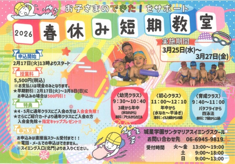 申込場所:城星学園サンタマリアスイミングスクール受付(北門のスイミング入口より)