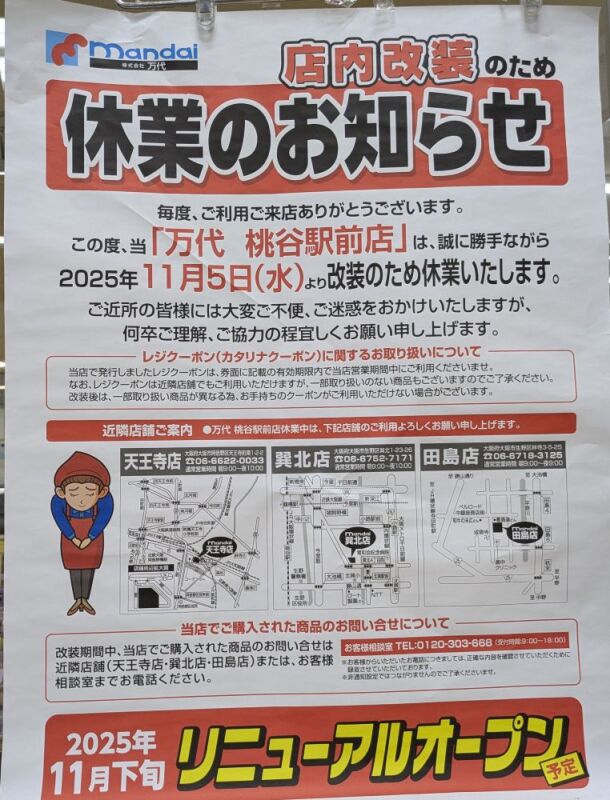 →万代桃谷駅前店 改装休業のお知らせ