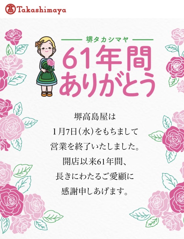 全国で百貨店や大型ショッピングモールの閉店が続いていますが、本日1月7日(水)には堺東の百貨店「高島屋堺店」が61年の歴史に幕をおろしました。大阪市内南部の人にとっては馴染みのある老舗店舗ですが、近年は周辺に大型ショッピングモールが開業したりしてするなど環境の変化の影響も一因だったのかもしれません。今日の閉店日にはたくさんの人がお別れに訪れたようです。また、中央区では1994年からファッション界を盛り上げてきた「心斎橋オーパ」が1月12日(月・祝)営業を終了する予定です。