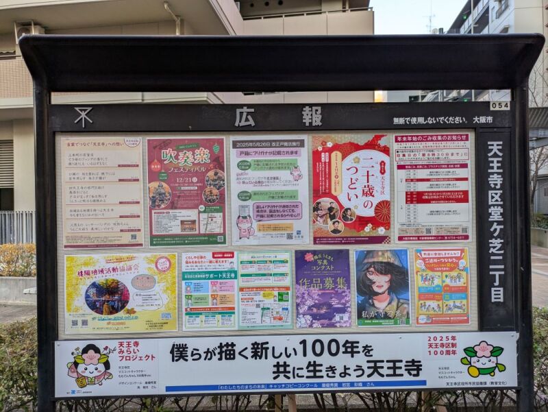 天王寺区堂ヶ芝二丁目の掲示板(12/16)☆街の掲示板 Posted on 2025年12月16日2025年12月19日 by うえまちウェブ編集者 ・12/21(日)てんのうじ吹奏楽フェスティバル ・天王寺区二十歳のつどい ・年末年始ごみ収集のお知らせ ほか