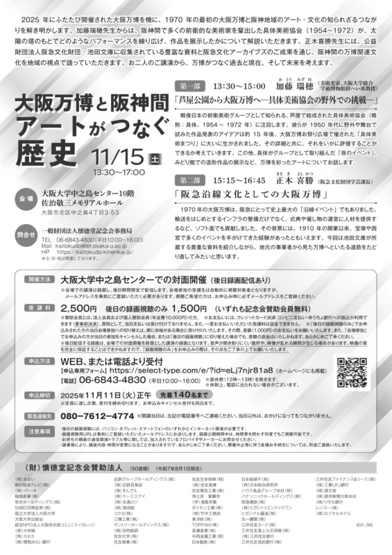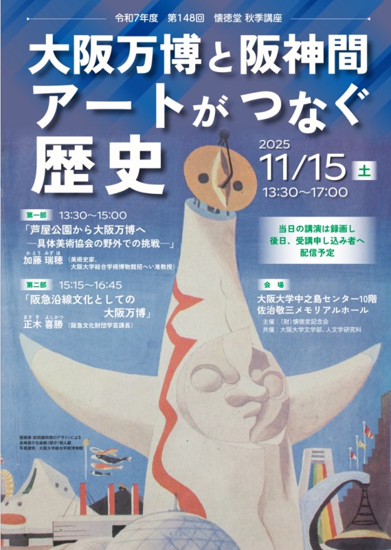第148回懐徳堂 秋季講座「大阪万博と阪神間─アートがつなぐ歴史」開催、受講生募集中。