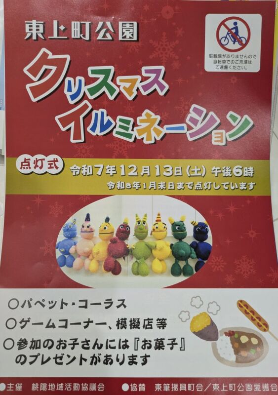 東上町公園クリスマスイルミネーション Posted on 2025年12月12日2025年12月22日 by うえまちウェブ編集者 東上町公園(天王寺区東上町7−38) 点灯式:12月13日(土)18時~