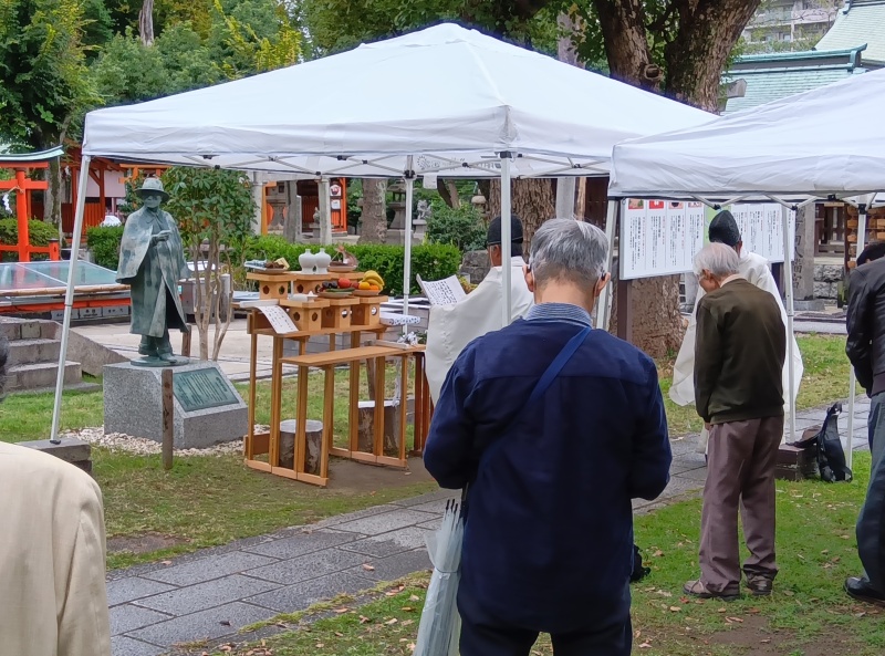 あいにくの小雨ぎみのお天気の中、織田作之助像の前でオープニングセレモニー。ご神職による霊祭が執り行われました。