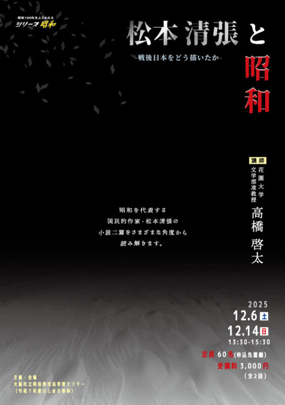 さて、昭和時代を振り返る講座「シリーズ昭和」、現在2講座の参加者を募集しています。先月お知らせした「旅する少女歌劇団」に続き、今月は12月に開催の「松本清張と昭和 -戦後日本をどう描いたか-」についてお知らせしたいと思います。