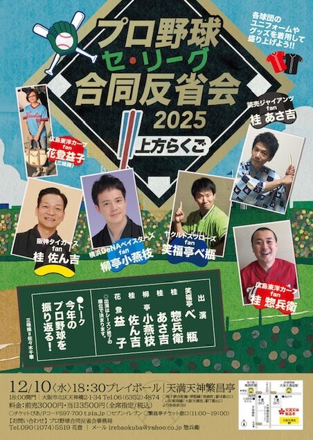 12/10 上方らくご「プロ野球合同反省会 セ・リーグ編」 Posted on 2025年12月2日2025年12月2日 by うえまちウェブ編集者 →天満天神繁昌亭 12月10日(水) プロ野球合同反省会 セ・リーグ編 桂あさ吉/桂佐ん吉/笑福亭べ瓶/桂惣兵衛/柳亭小燕枝/花登益子 【トーク】今年のセ・リーグをふり返る 開演:午後6時30分(6時開場)全席指定 前売3,000円 当日3,500円 お問合せ:惣兵衛 irebaokuba@yahoo.co.jp ハナト 090-1074-5519