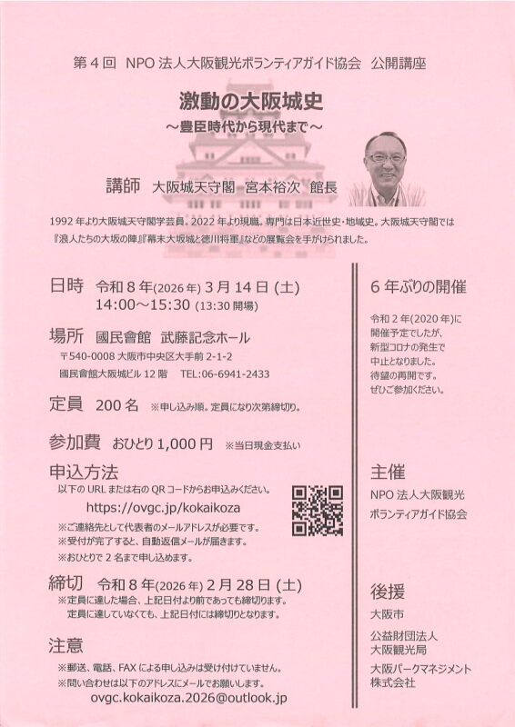 第4回 NPO 法人大阪観光ボランティアガイド協会 公開講座「激動の大阪城史~豊臣時代から現代まで~」開催のお知らせ