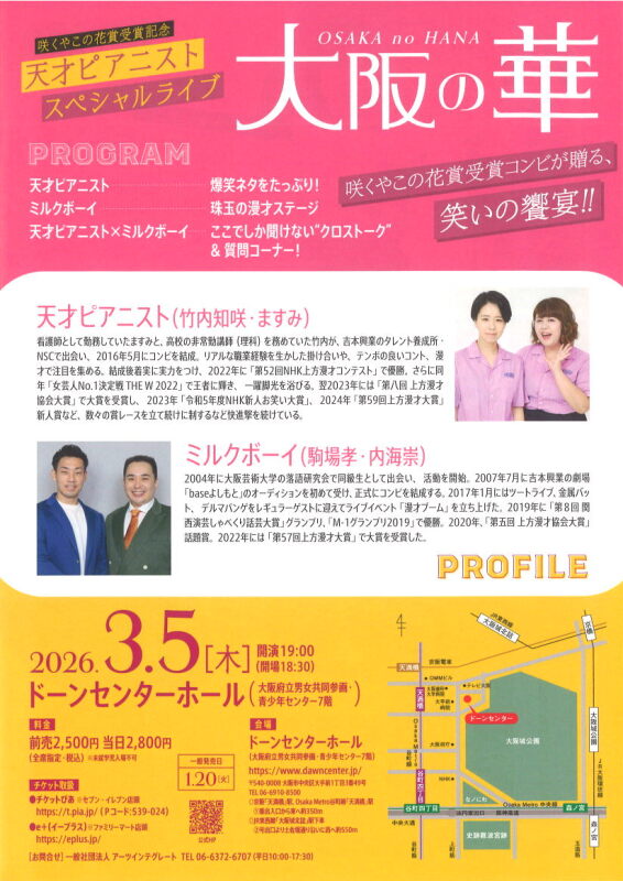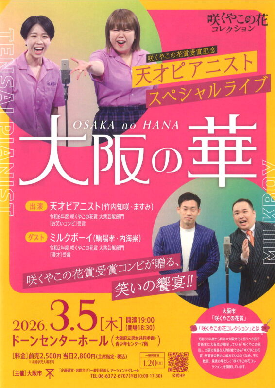→大阪市HP「咲くやこの花賞受賞記念スペシャルライブ「天才ピアニスト 大阪の華~咲くやこの花賞受賞コンビが贈る、笑いの饗宴~」