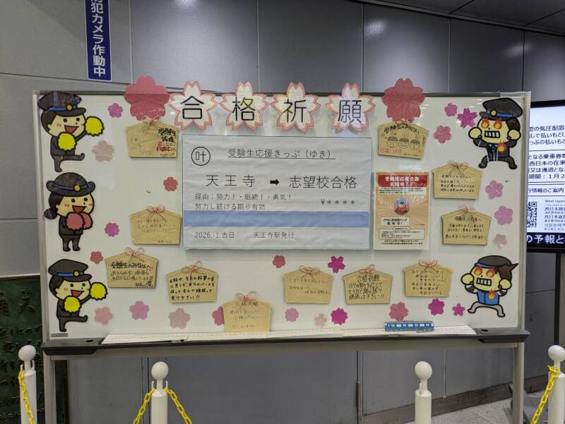 JR天王寺駅「合格祈願」ホワイトボード登場! Posted on 2026年1月23日2026年1月23日 by うえまちウェブ編集者 JR天王寺駅中央口改札前の中央コンコースに、受験生に向けた応援メッセージが登場。 合格祈願として、「志望校合格」ゆきのきっぷも貼られていて、学生だけでなく、大人たちが足を止めて撮影をしている姿も。 受験生の皆様、あともう少し! 体調に気をつけてがんばってください!