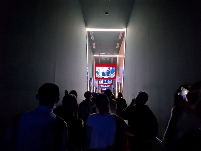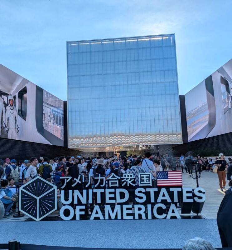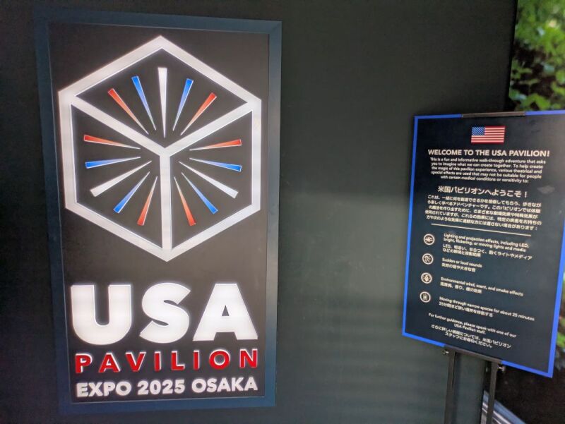 連日大にぎわいの関西・大阪万博。東ゲート入場後すぐに目に留まるアメリカ館は、予約なし枠しか現在設定されていないため、平日でも長蛇の列。