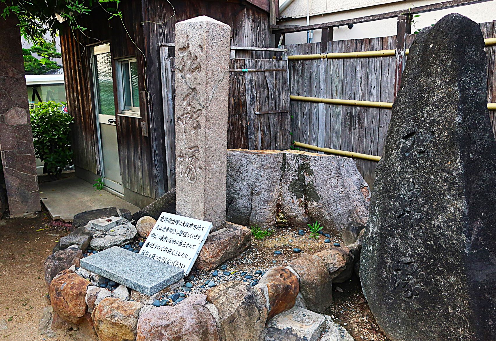 後鳥羽上皇の寵愛を受けた2人の女官(松虫と鈴虫)が、法然上人の話に感銘を受けて出家。その後、松虫はこのあたりに庵を結び、余生を過ごした、といいます。塚の傍らには数年前まで樹齢800年といわれるエノキが立っており、伝承の時代とも重なります。