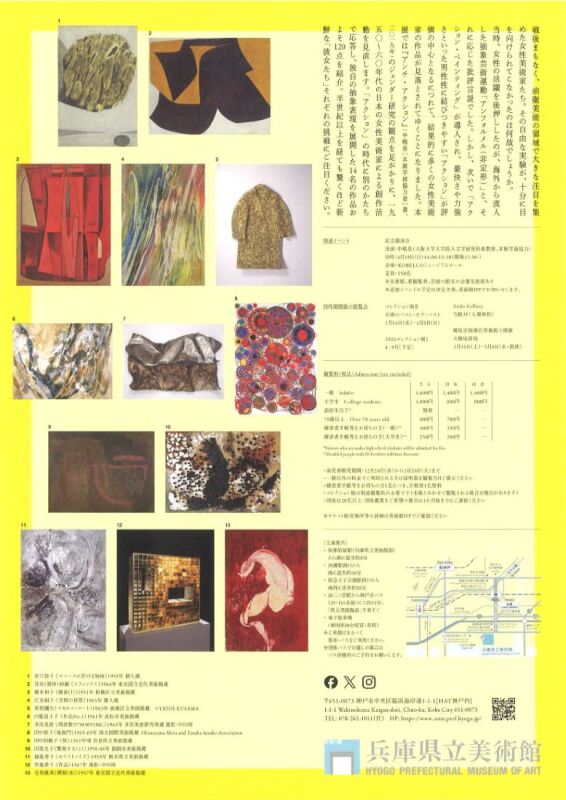 明石市出身で、ヴェネツィア・ビエンナーレ日本館へ女性で初めて選ばれた江見絹子さんほか、白髪富士子、白髪一雄、田中敦子、山崎つる子、金山明、嶋本昭三、村上三郎、元永定正など、兵庫県ゆかりの作品が鑑賞できます。
